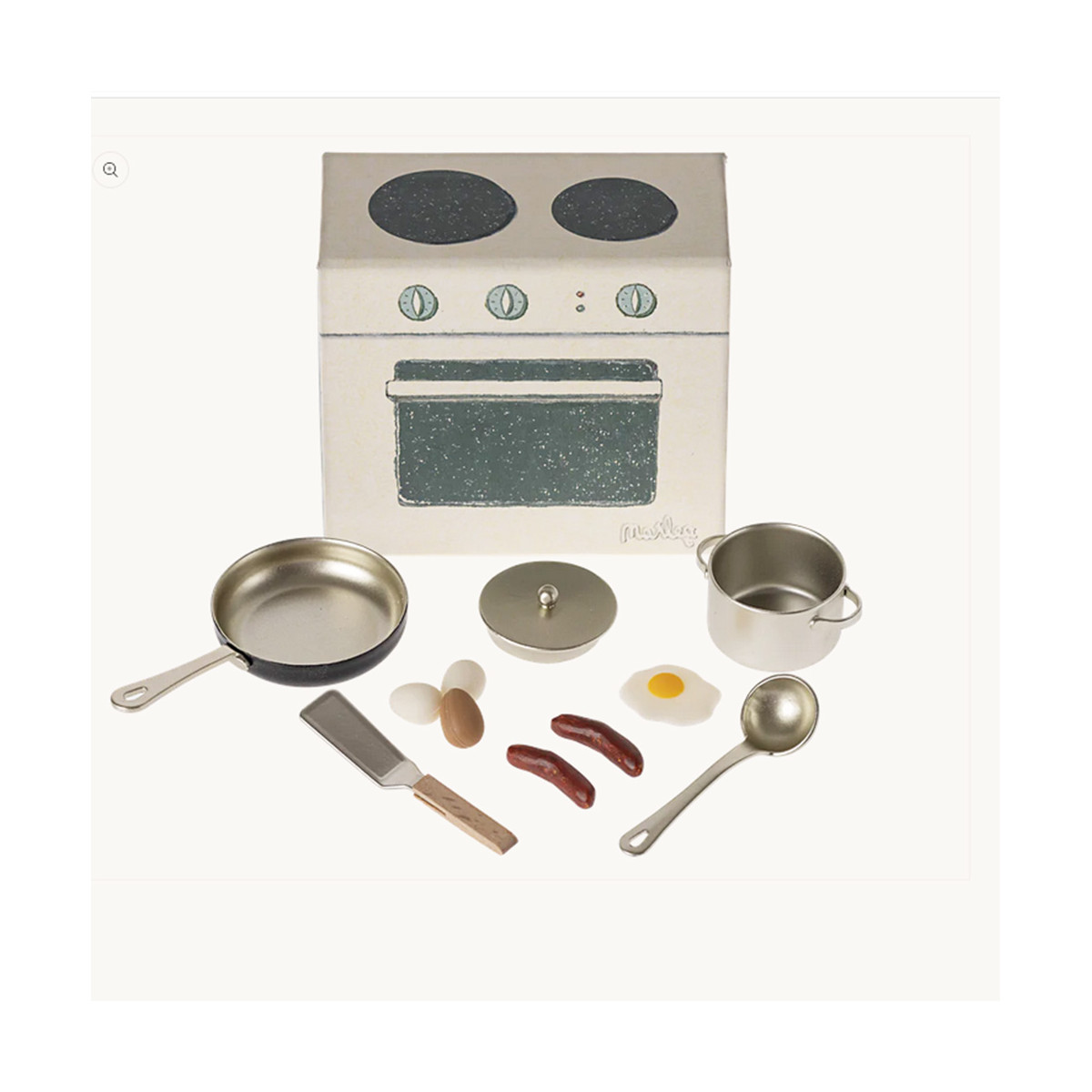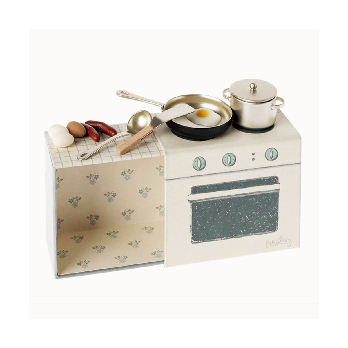 The playful stove box opens up to reveal everything you need to cook a perfect imaginary brunch. The set includes a saucepan, a frying pan, a lid, two ustensils, 2 sausages, 4 eggs.