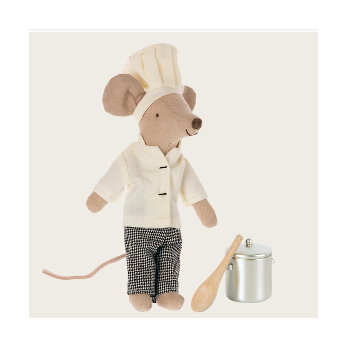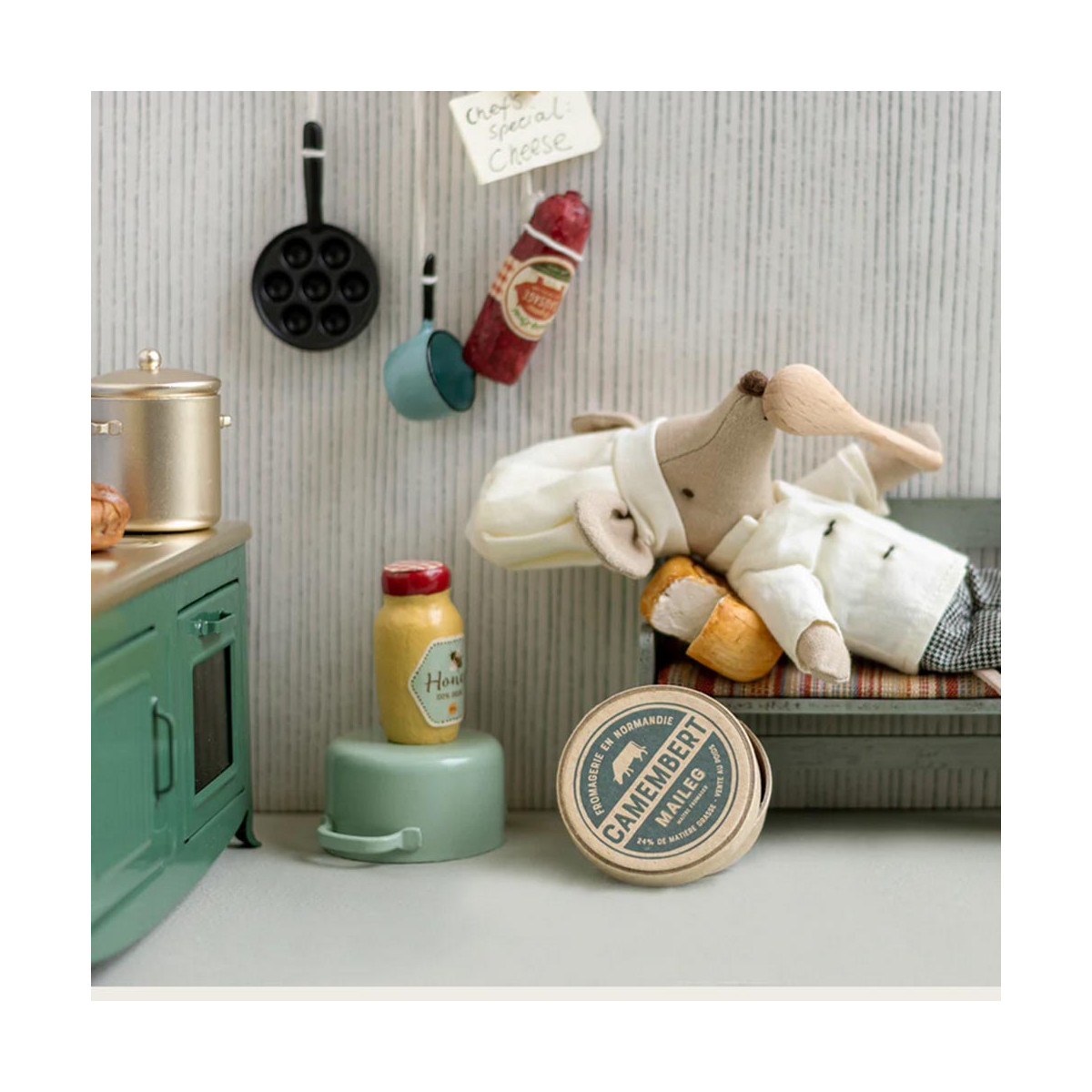 A lovely playset with a chef mouse, soup pot, and spoon. Make dinner time a play with this sweet set. Match it up with Maileg's kitchen collection and miniature food for the story to continue.