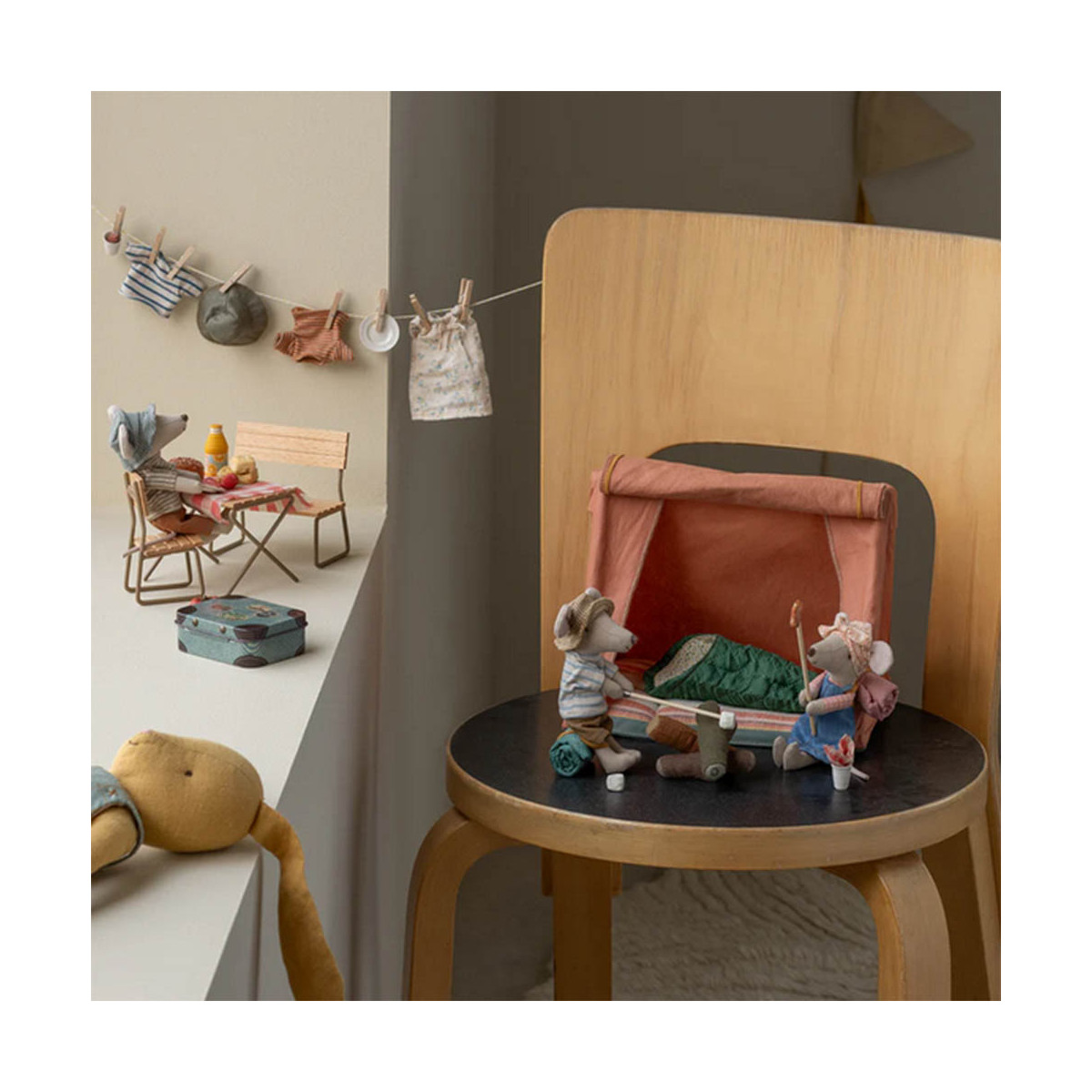 - TENTE COMPLETE MINIATURE POUR SOURIS MAILEG est livrée avec son matelas/oreiller et sa couverture à rayures
