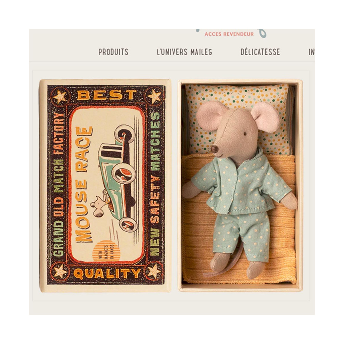 - PETIT FRERE SOURIS MAILEG DANS SA BOITE D ALLUMETTE porte un ensemble assorti aux coloris fort printaniers
