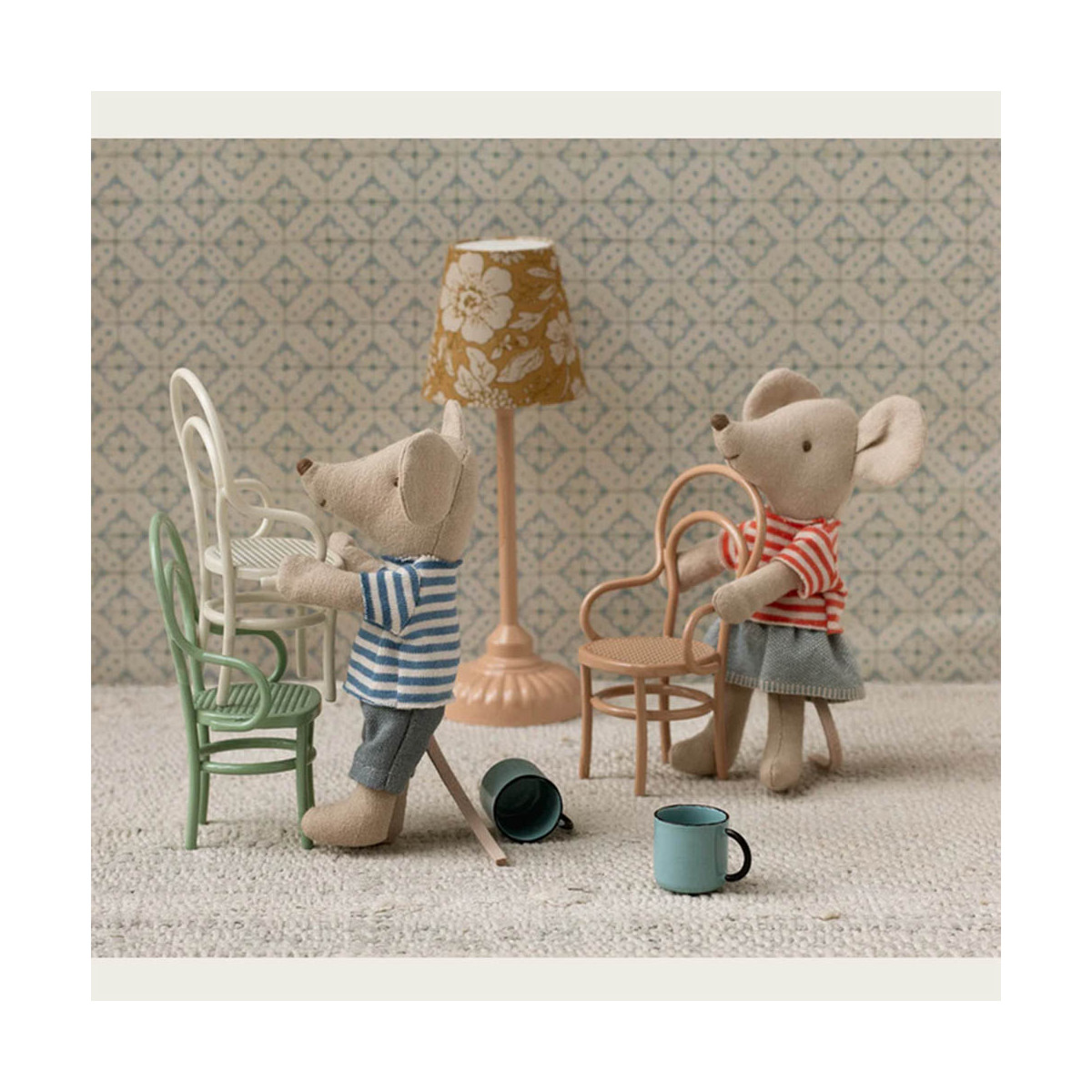 Maileg propose les animaux, les meubles, les accessoires, et plante le décor...Les jeux proposés restent "ouverts" pour stimuler l'inventivité en s'amusant et "libres" afin de ne pas entraver les facultés.