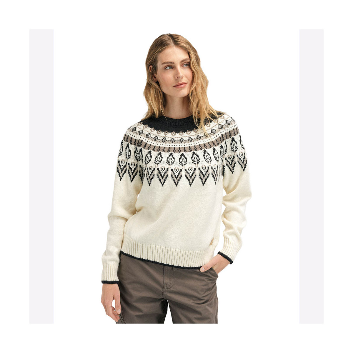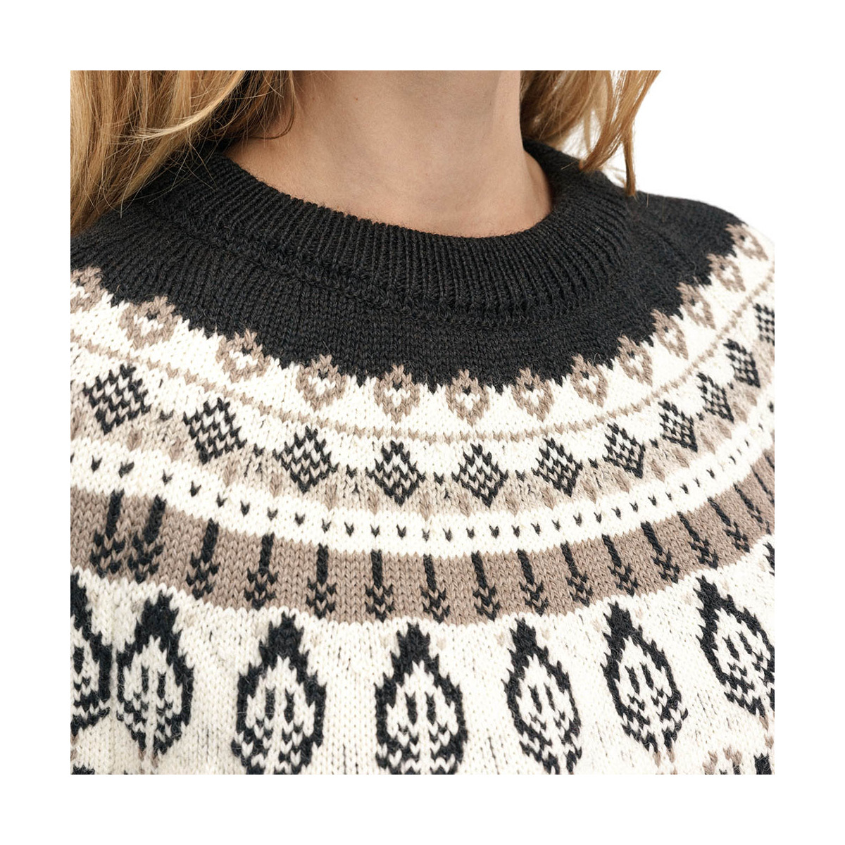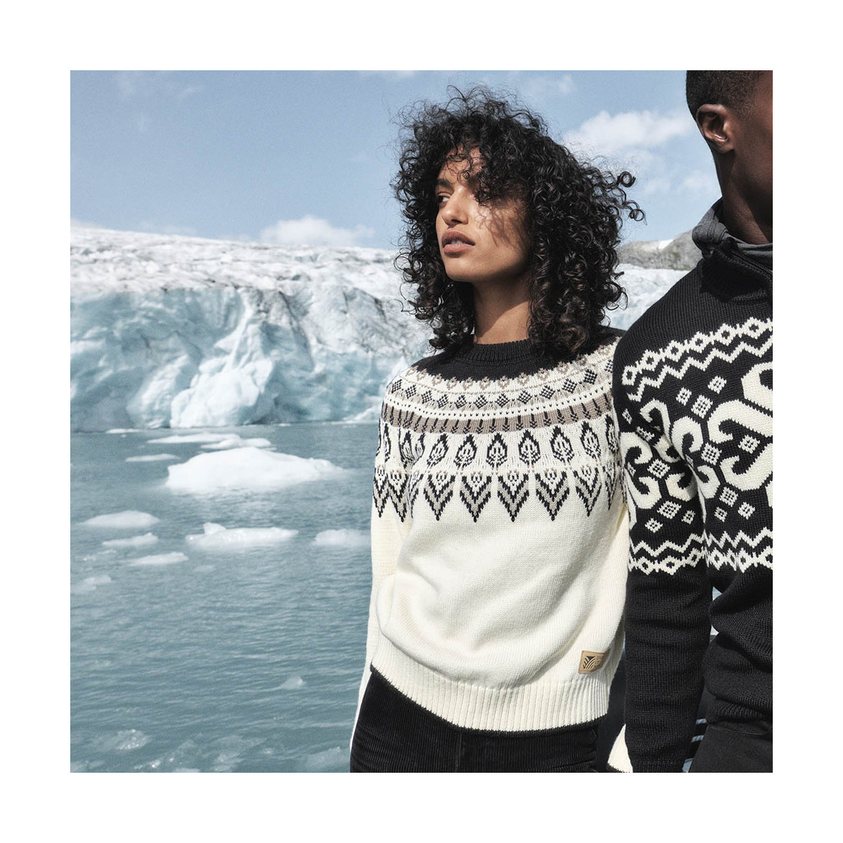 Un pull en laine épaisse à jacquard et à la coupe décontractée. Conçu comme un pull islandais, il présente une construction classique avec des manches raglan. Sula est un pull épais et confortable, tricoté en 100 % laine longue durée. Quant au motif, il est inspiré d'un jacquard floral issu des archives Dale. Les fines rayures contrastées de la taille côtelée et les poignets côtelés des manches sont également caractéristiques des pulls Dale historiques.