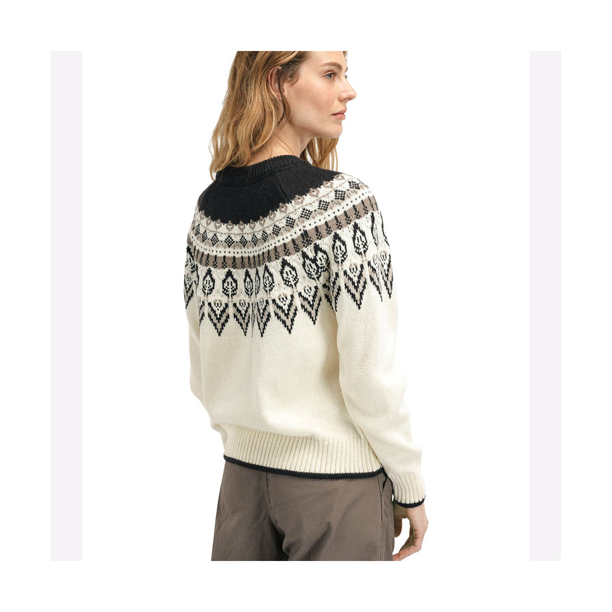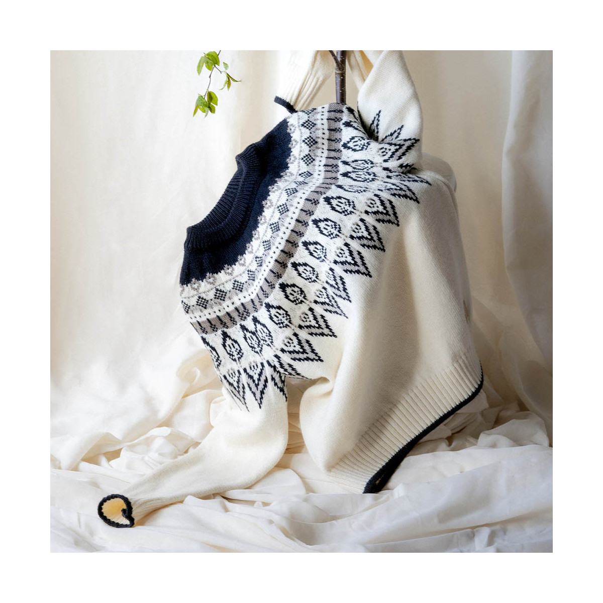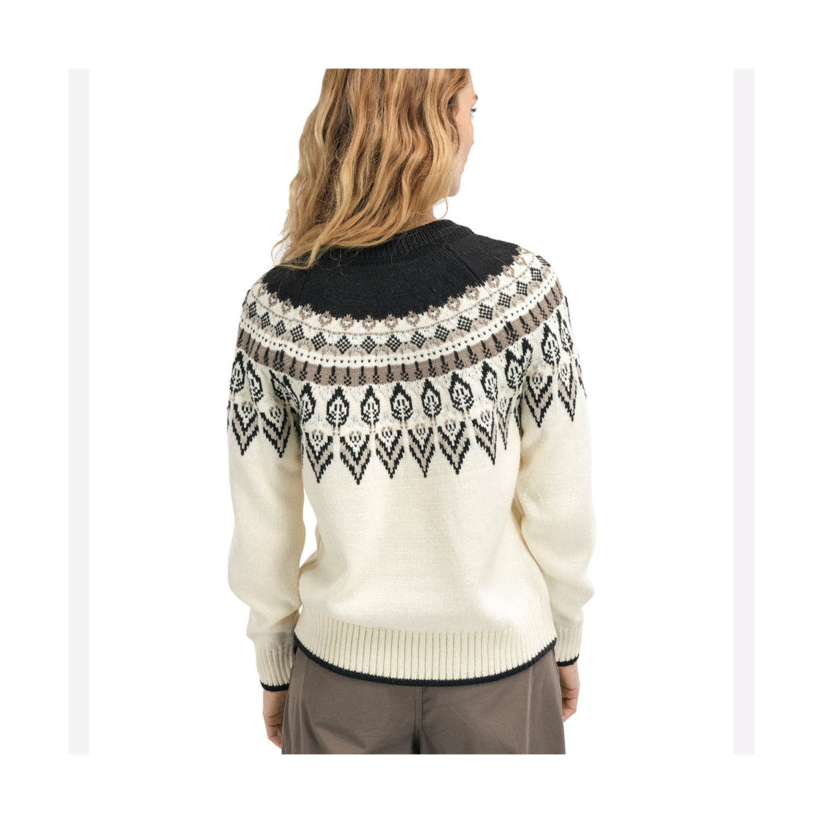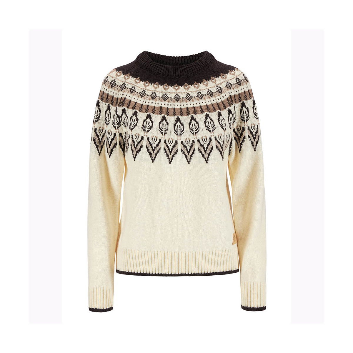 Un pull en laine épaisse à jacquard et à la coupe décontractée. Conçu comme un pull islandais, il présente une construction classique avec des manches raglan. Sula est un pull épais et confortable, tricoté en 100 % laine longue durée. Quant au motif, il est inspiré d'un jacquard floral issu des archives Dale. Les fines rayures contrastées de la taille côtelée et les poignets côtelés des manches sont également caractéristiques des pulls Dale historiques.