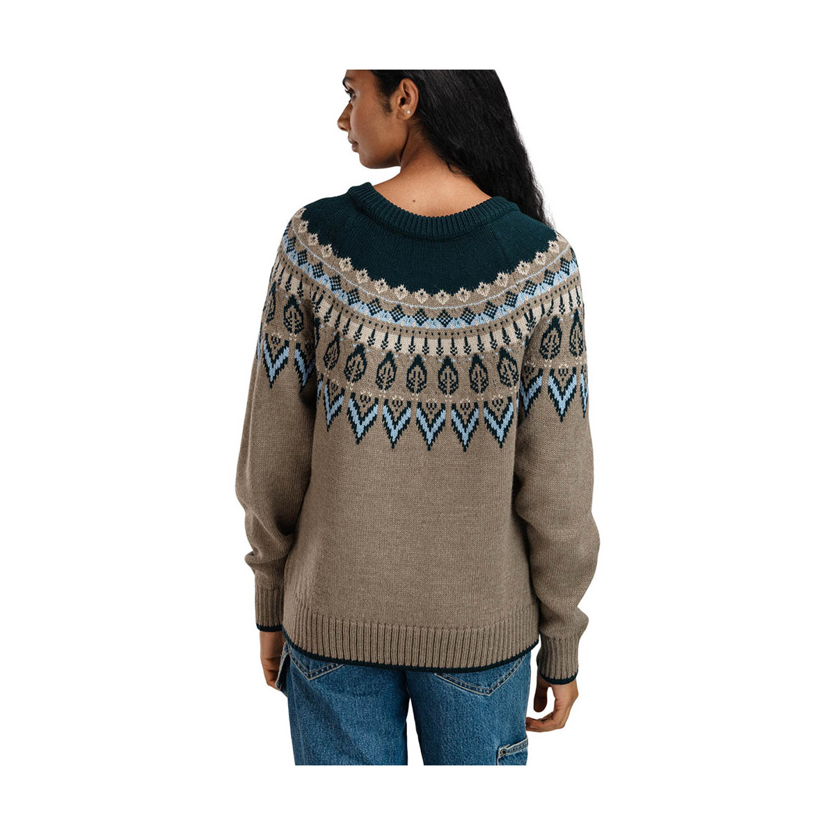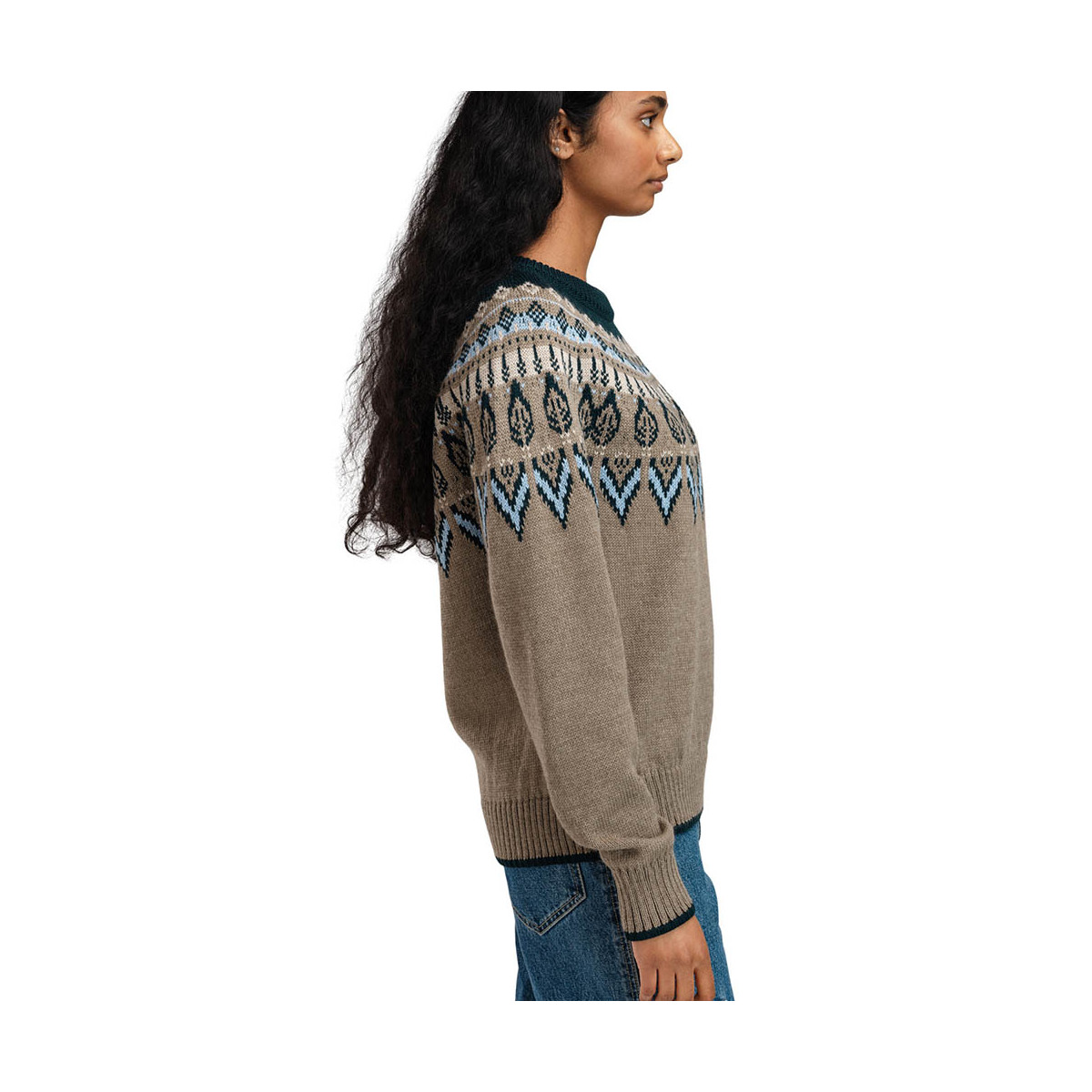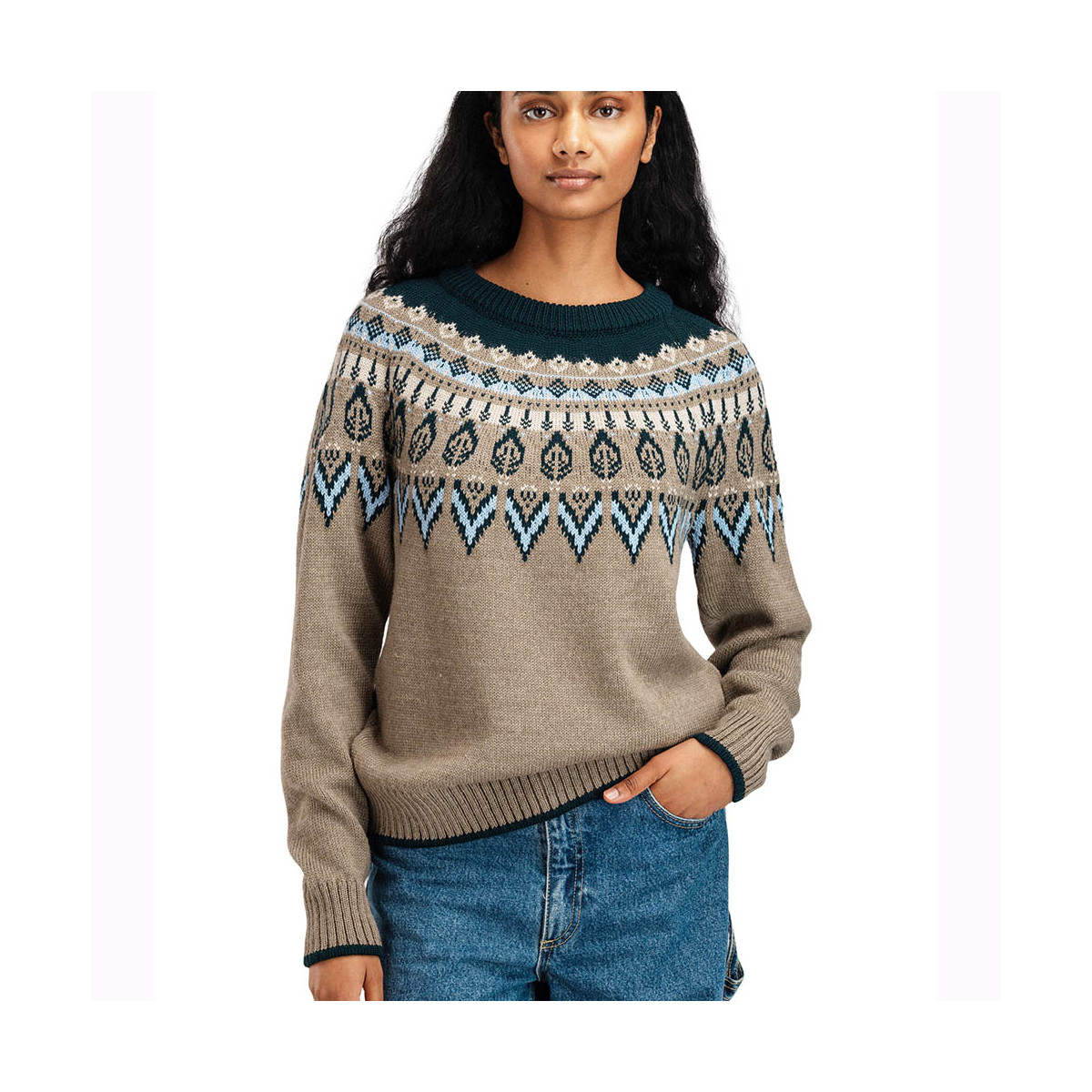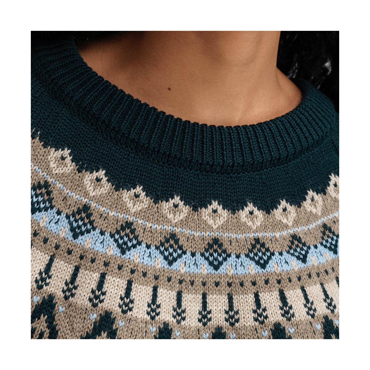 Un pull en laine épaisse à jacquard et à la coupe décontractée. Conçu comme un pull islandais, il présente une construction classique avec des manches raglan. Sula est un pull épais et confortable, tricoté en 100 % laine longue durée. Quant au motif, il est inspiré d'un jacquard floral issu des archives Dale. Les fines rayures contrastées de la taille côtelée et les poignets côtelés des manches sont également caractéristiques des pulls Dale historiques.