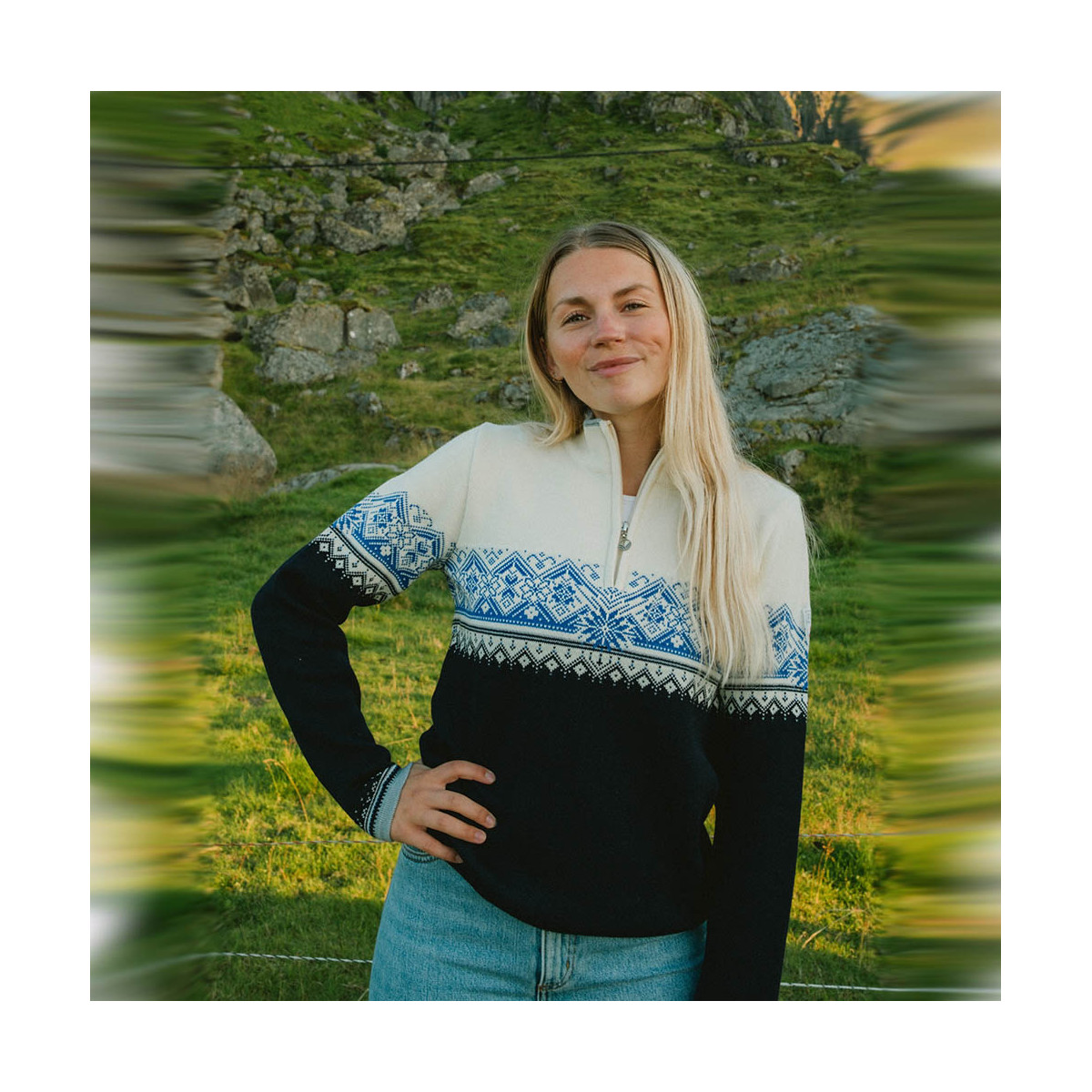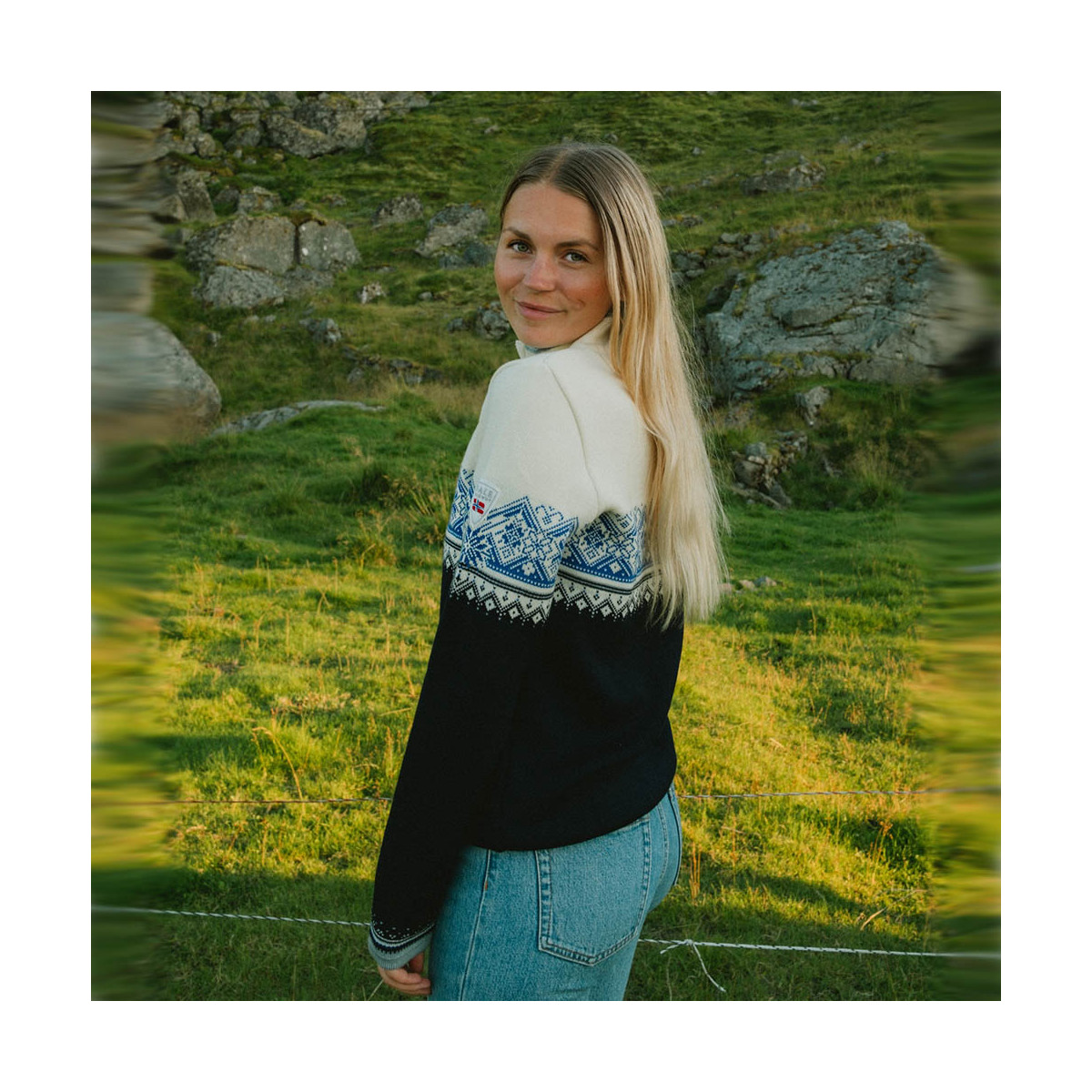 Ce pull à la coupe féminine a été spécialement conçu pour le Championnat du monde de ski à St-Moritz, en Suisse en 2003. Le modèle a été mis au goût du jour grâce à la nouvelle technologie de tricotage inventée par Dale of Norway pour en faire un pull léger, élastique et très confortable, ce qui en fait l'un des best-sellers de la collection.